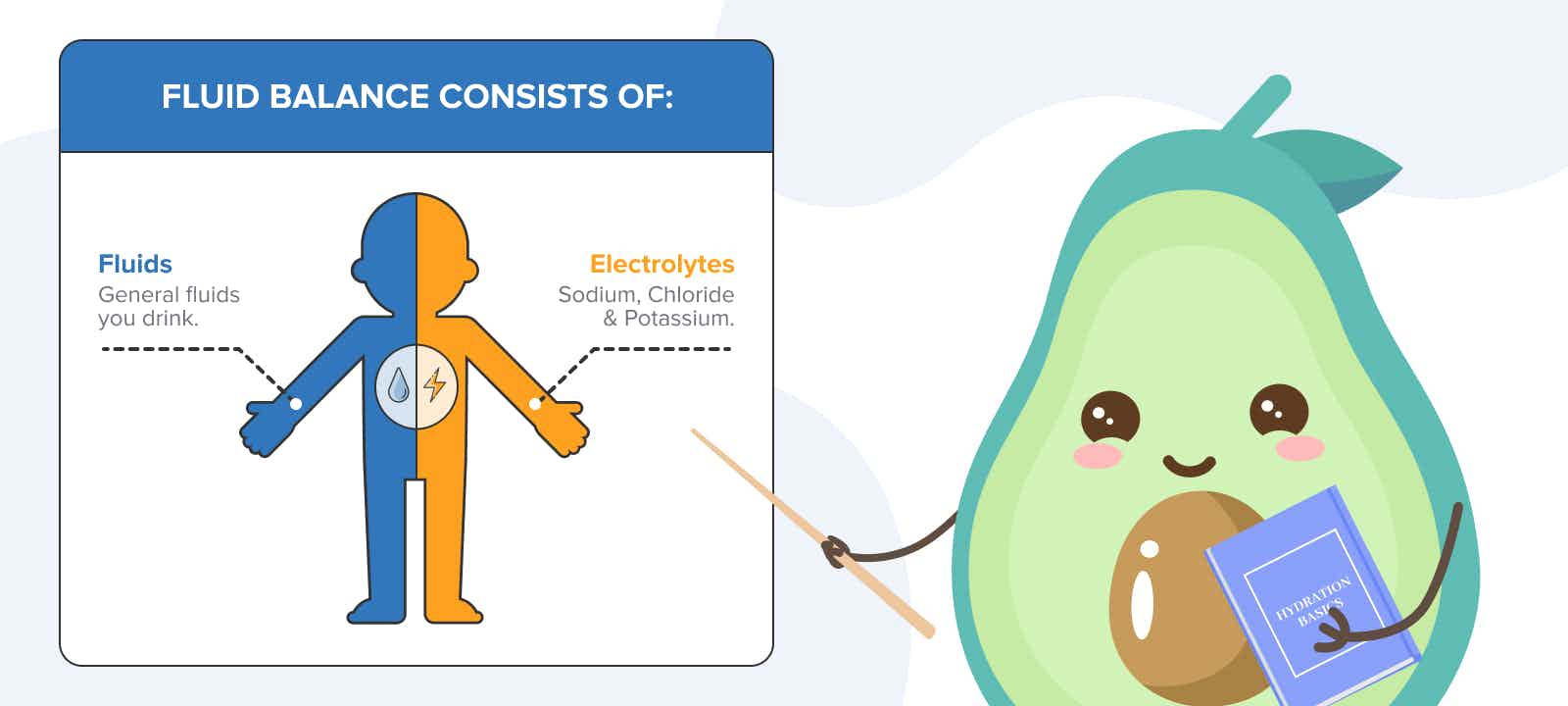 The equilibrium of water in your body is called fluid balance, and the fluids you drink are just one input into that system. The other main inputs are sodium, chloride, and potassium—electrolytes that regulate fluid levels inside and outside of cells.[*]